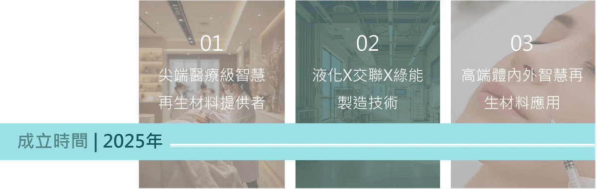 公司成立於 2025 年,我們是一家以材料科學與再生醫學為核心的技術型新創公司,專注於智慧黏彈液態再生平台(Smart ViscoelasticLiquid Regeneration Platform, SVL-RP)的研發與應用,橫跨再生醫學與高端再生醫美領域。SVL-RP 平台透過材料結構設計與動態調控機制,建立兼具支撐性、可控性與可回復性的再生材料系統,滿足不同臨床需求,支援無針跨層遞送、外泌體促滲/載體及植入型再生材應用,提供從保養、美容到臨床治療的全層再生解決方案,展現尖端科技帶來的安全可靠效果。