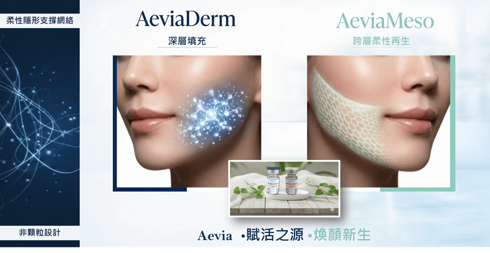 AeviaMeso 與 AeviaDerm 採用相同核心成分,但設計更靈活,它不僅可適用於全臉,施打至淺層肌膚,用於細紋改善、膚質優化與再生導引,實現從表皮到皮下的全層肌膚改善。
