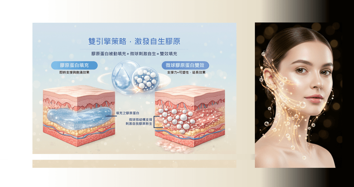萱源採用雙引擎策略—膠原蛋白被動填充&微球刺激自生膠原增生雙效技術,不僅提供即時支撐,塑造自然曲線,還能持續喚醒肌膚自身膠原活力。