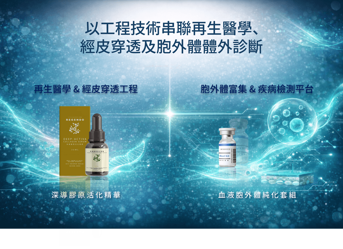以材料結構設計為核心,發展具「深層導入、微環境調控、組織活化」能力的功能性系統,定位為醫工升級型解決方案,而非單純表層保養。 - 精準診斷與細胞外體工程(EV-based Diagnostics & Bioseparation)